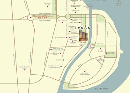 The Peak酒店位于金边市中心,面向滨海艺术中心,坐落在城市的十字路口。时间是宝贵的,这个位置也是如此,只需几的就可以到达永旺购物中心和Naga金界娱乐中心,以及国民议会大楼,外交部和澳大利亚大使馆。独立纪念碑和西哈努克大道距离酒店也咫尺之遥。