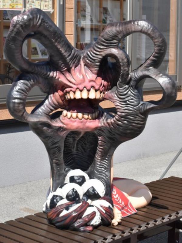 起初,人们认为这只怪物是一位辛勤工作甚至不吃米饭的女人,但在发现米饭的数量迅速减少后,人们发现这只怪物把饭团扔进藏在后脑勺的嘴里。横井长凳的雕刻家(53岁)解释说:“横井长凳的背面是必须看的,这是以前任何(横井长凳)都没有过的独特之处。”