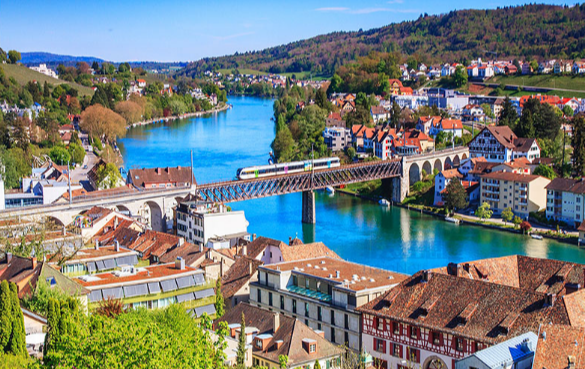 莱茵河从康斯坦斯湖流出,向西流经莱茵河瀑布,并与它的主要支流阿雷河汇合。Aare是莱茵河水量的两倍多,平均水量接近1000米